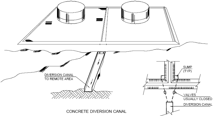 The dyke may be constructed of earth, concrete, solid masonry or steel. It may be square, Rectangular, circular or irregular in shape, conforming to the natural terrain around the tank.